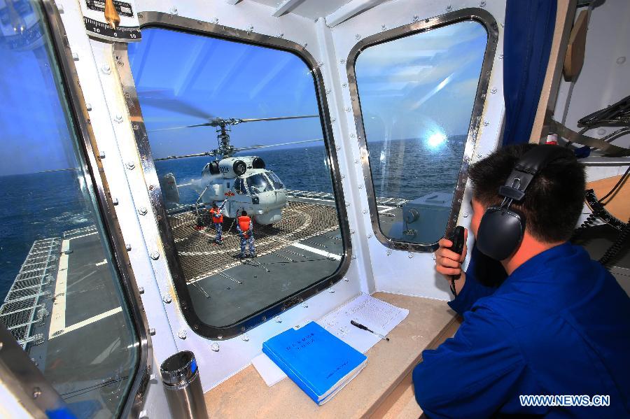 A commander directs a navy helicopter to take off from China's Zhengzhou missile destroyer during the China-Russia joint naval drill on East China Sea, May 24, 2014. The three-day drill "Joint Sea-2014" ended successfully on Saturday. The Chinese and Russian navies staged exercises, including joint escort drill, joint aircraft identification exercise and air defense and maritime assault drills. (Xinhua/Zha Chunming)