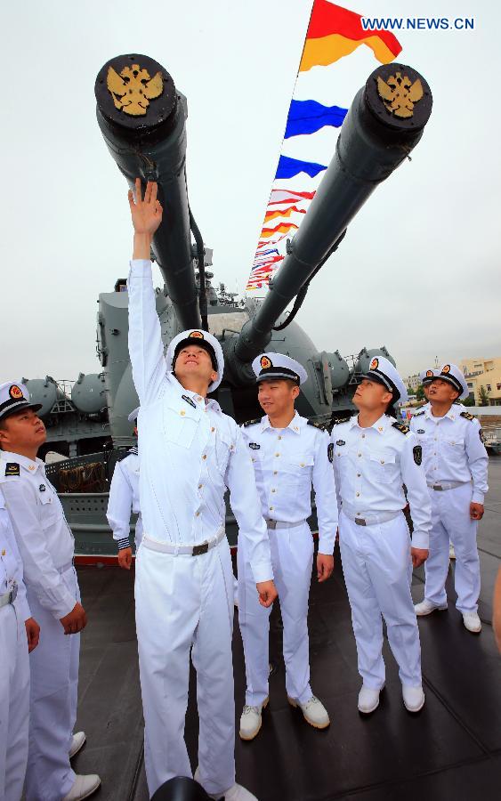 Soldiers of China's missile destroyer Zhengzhou visits Russian guided missile cruiser Varyag in Shanghai, east China, May 19, 2014. Chinese and Russian naval forces held interchange activities on Monday to enhance mutual communication. (Xinhua/Zha Chunming)