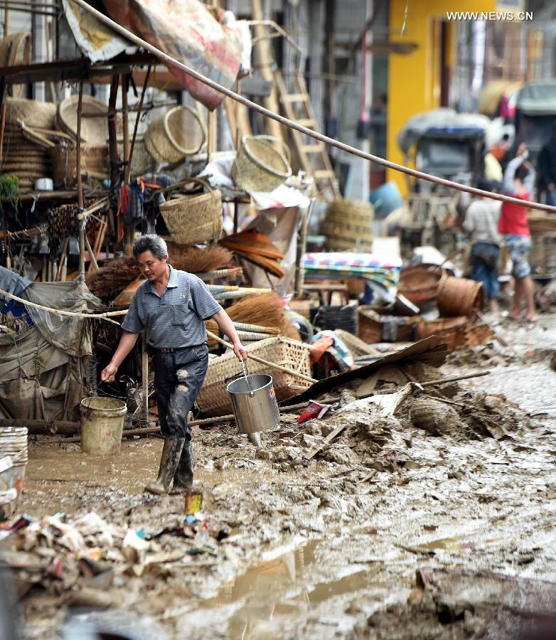 A man walks on a muddy road after a flood withdrew in Chenjiafang Town, Shaoyang County, central China's Hunan Province, May 26, 2014. Hunan issued the red alert of floods on May 25 as continuous downpours hit many parts of the province. A total of 400,000 people were affected and 16,776 displaced with the collapse of 520 houses. (Xinhua/Li Ga)