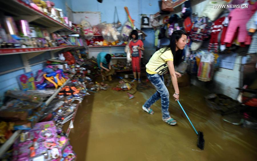 A girl sweeps murky water from a flooded grocery in Chenjiafang Town, Shaoyang County, central China's Hunan Province, May 26, 2014. Hunan issued the red alert of floods on May 25 as continuous downpours hit many parts of the province. A total of 400,000 people were affected and 16,776 displaced with the collapse of 520 houses. (Xinhua/Li Ga)