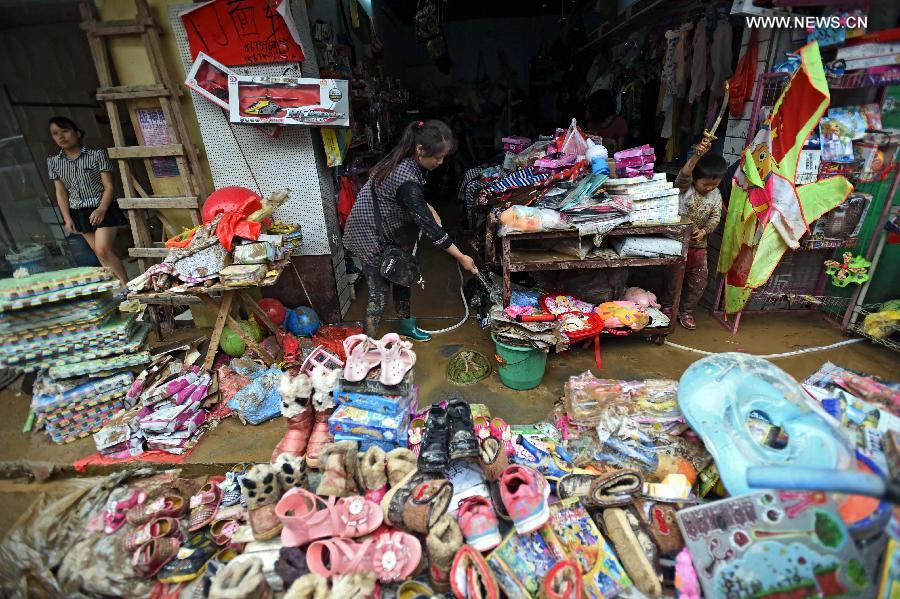 A shopkeeper cleans goods soaked by flood water in front of a grocery in Chenjiafang Town, Shaoyang County, central China's Hunan Province, May 26, 2014. Hunan issued the red alert of floods on May 25 as continuous downpours hit many parts of the province. A total of 400,000 people were affected and 16,776 displaced with the collapse of 520 houses. (Xinhua/Li Ga)