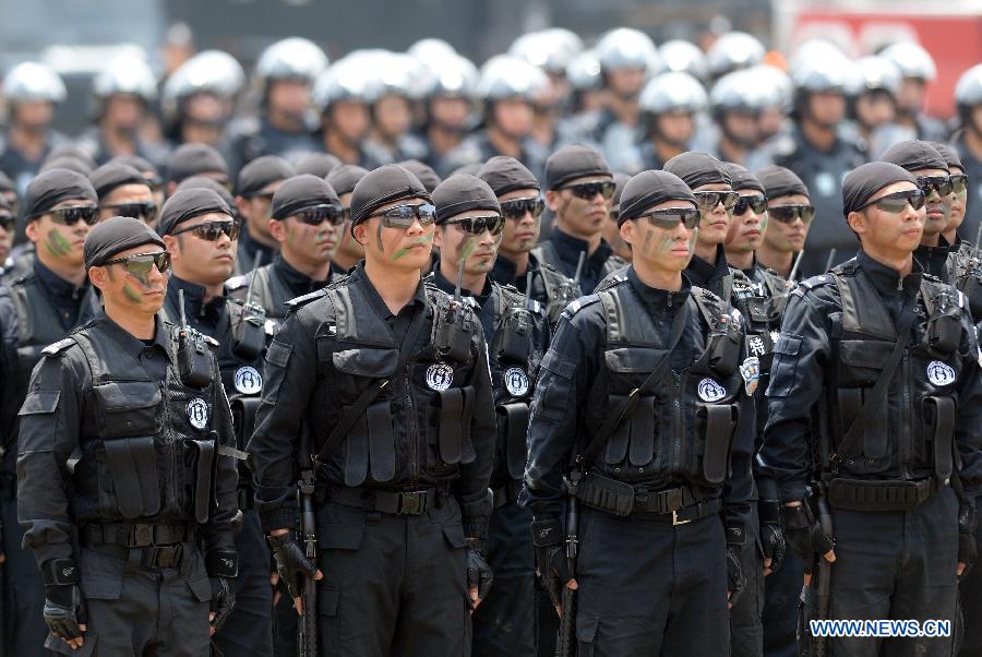 Policemen attend an anti-terrorism drill in Shaoxing, east China's Zhejiang Province, May 27, 2014. Police of Zhejiang Province held an anti-terror drill on Tuesday.(Xinhua/Wang Dingchang)