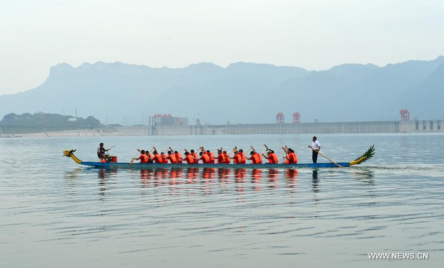 Participants paddle in a practice for dragon boat race ahead of the Dragon Boat Festival in Zigui County of Yichang City, central China's Hubei Province, May 28, 2014. The Dragon Boat Festival, which falls on June 2 this year, is believed to be designed to commemorate the death of Qu Yuan, a patriot poet during the Warring State Period (475-221 BC). As the festival approaches, people in Zigui County, hometown of Qu Yuan, have prepared various activities including hanging mugwort leaves, holding dragon boat races and making Zongzi, a pyramid-shaped dumpling made of glutinous rice wrapped in bamboo or reed leaves, for celebrations. (Xinhua/Zheng Jiayu)