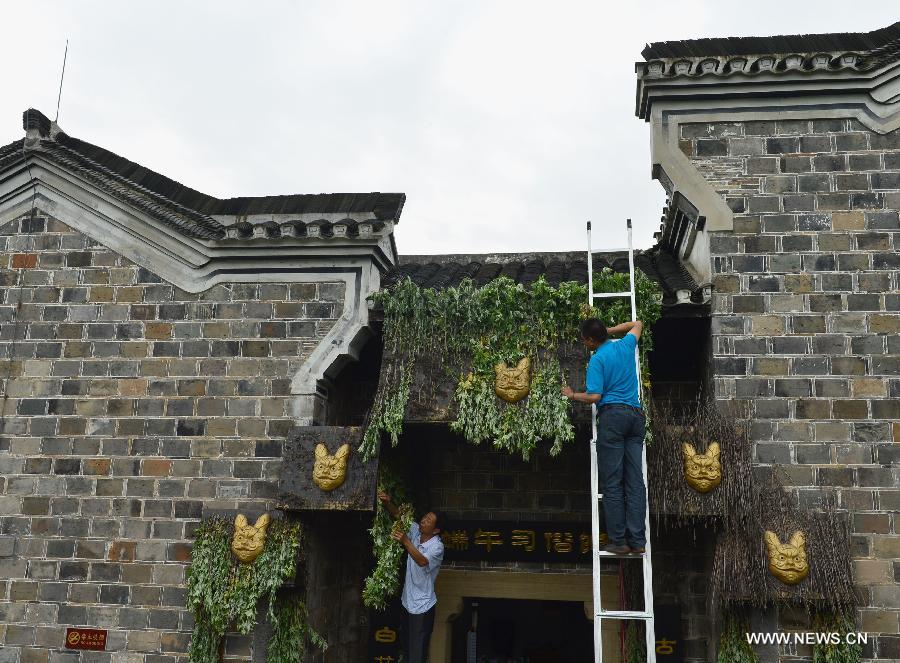 | People hang mugwort leaves at the entrance of their house ahead of the Dragon Boat Festival in Zigui County of Yichang City, central China's Hubei Province, May 28, 2014. The Dragon Boat Festival, which falls on June 2 this year, is believed to be designed to commemorate the death of Qu Yuan, a patriot poet during the Warring State Period (475-221 BC). As the festival approaches, people in Zigui County, hometown of Qu Yuan, have prepared various activities including hanging mugwort leaves, holding dragon boat races and making Zongzi, a pyramid-shaped dumpling made of glutinous rice wrapped in bamboo or reed leaves, for celebrations. (Xinhua/Zheng Jiayu) |