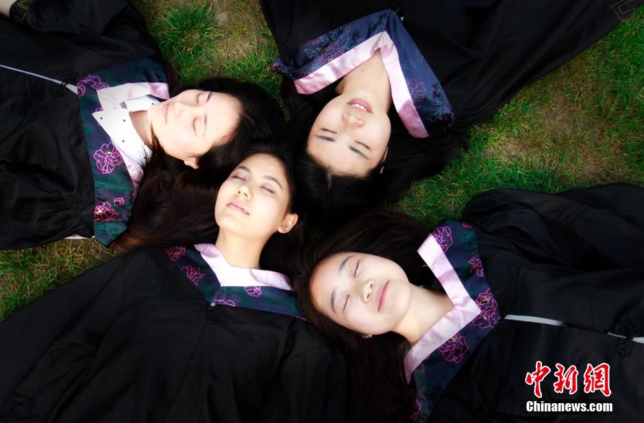 College students from Southwest University for Nationalities pose for group photos to mark their graduation on May 28, 2014. (CNS/Huang Song Zhe)