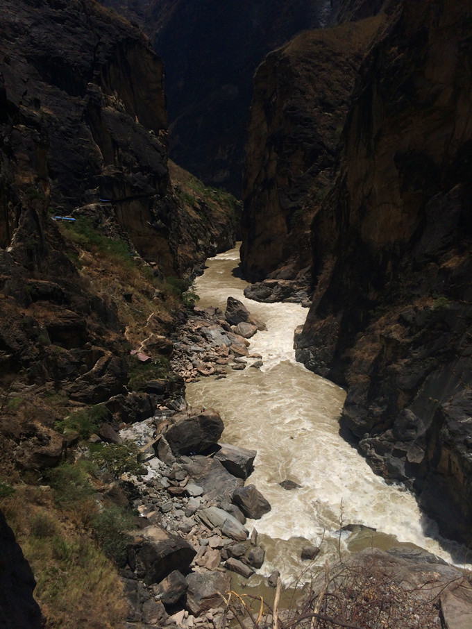 | Photo taken on May 24, 2014 shows the amazing scenery in Hutiao Gorge. Hutiao Gorge is located in the upper reaches of the Jinsha River, to the northeast of Lijiang, in southwest China's Yunnan Province. The narrowest stretch in the river is only about 30 meters across. According to a legend, a tiger failed to jump across the river at that point. The river is about 29 kilometers long, reaching 3,790 meters in depth between Jade Dragon and Haba Snow Mountains, creating one of the most spectacular deep gorges in the world.(People's Daily Online/Huang Jin) |