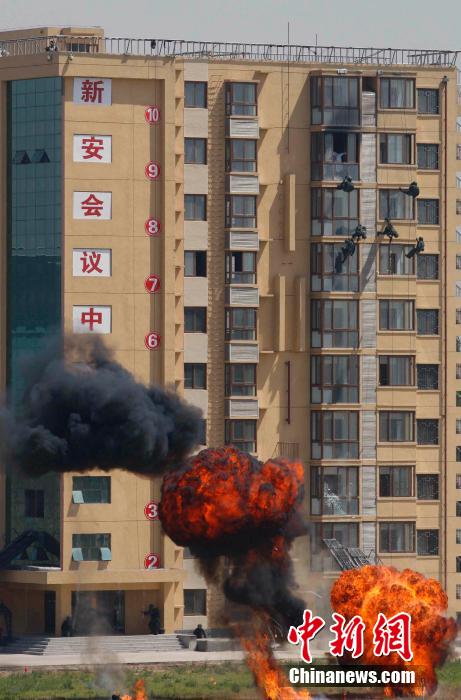 An anti-terrorism and riot comprehensive exercise is held in Beijing on Thursday. Special forces, fire and rescue departments jointly took part in the drill. The police are set to start a year-long nationwide anti-terrorism operation after attacks took place in Xinjiang and several cities across China, according to Xinhua News Agency. (CNS Photo)