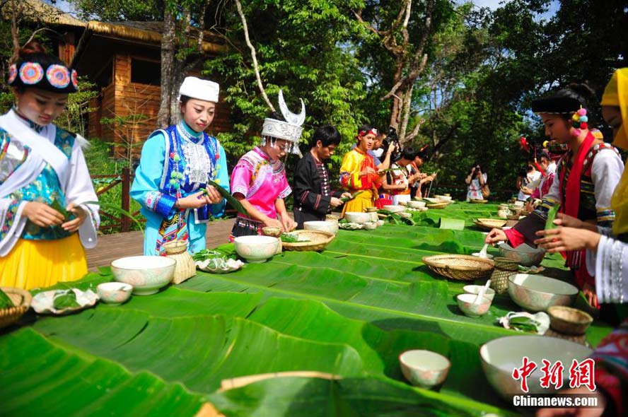 | People of 26 ethnic groups in festival dresses make rice dumplings together to greet the Dragon Boat Festival at the Taiyanghe National Forest Park in Pu’er, south China’s Yunnan province. (China News Service/Liu Ranyang) |