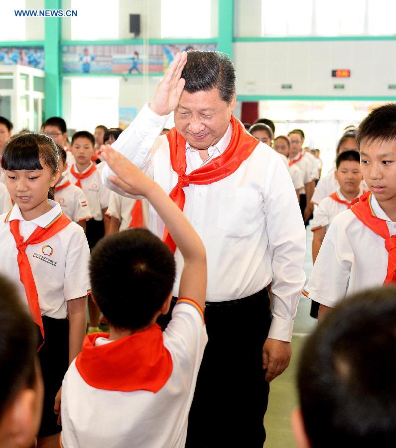 Chinese President Xi Jinping attends an initiation ceremony of Young Pioneers during his visit at Beijing Haidian National Primary School in Beijing, capital of China, May 30, 2014. Xi attended an activity to celebrate the upcoming International Children's Day at the primary school. (Xinhua/Li Tao)