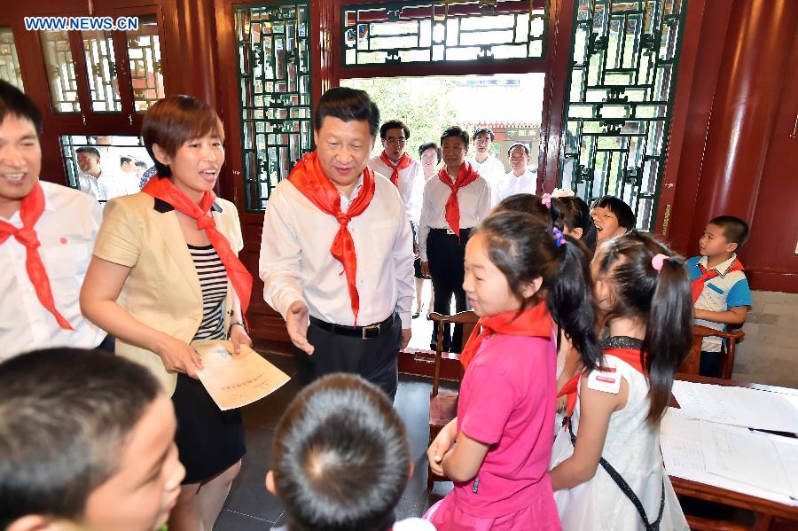 Chinese President Xi Jinping listens to children who are reciting classic Chinese texts during his visit at Beijing Haidian National Primary School in Beijing, capital of China, May 30, 2014. Xi attended an activity to celebrate the upcoming International Children's Day at the primary school. (Xinhua/Li Tao)
