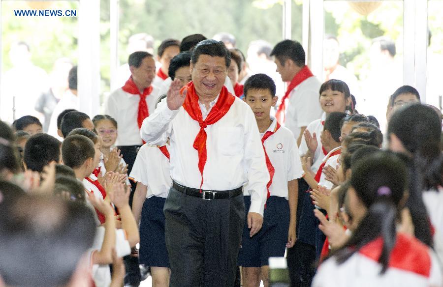 Chinese President Xi Jinping attends an initiation ceremony of Young Pioneers during his visit to Beijing Haidian National Primary School in Beijing, capital of China, May 30, 2014. Xi attended an activity to celebrate the upcoming International Children's Day at the primary school. (Xinhua/Xie Huanchi)