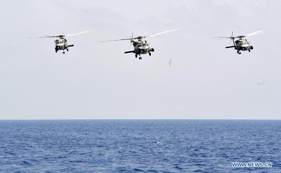 Three helicopters fly in a military drill in the Mediterranean Sea in Turkey, on May 31, 2014. Turkish Naval Forces launched a large-scale and wide-range military drill with the code name of White Storm-2014 in southwestern province of Antalya's Mediterranean Sea district. The training process will continue until June 1. (Xinhua/Cihan)