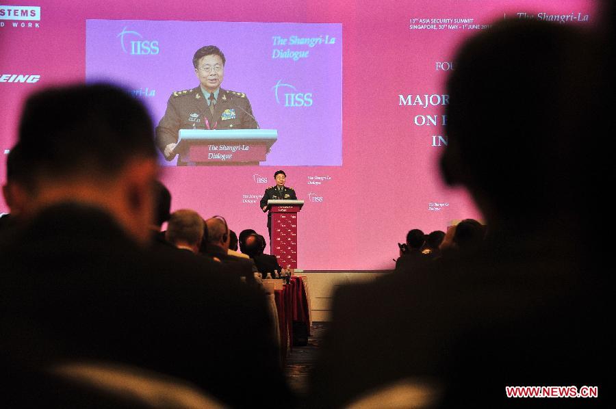 Wang Guanzhong, deputy chief of the General Staff of the Chinese People's Liberation Army, speaks during the fourth plenary session of the 13th Shangri-La Dialogue in Singapore June 1, 2014, the final day of the multilateral forum focusing on security issues in Asia. (Xinhua/Then Chih Wey)
