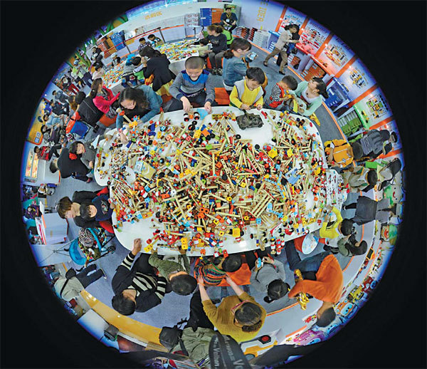 Children make toy block constructions at an animation show in Hangzhou, Zhejiang province. Traditional construction toys remained the top sellers on Amazon China's 2013 toy sales list, accounting for 25 percent of last year's sales. Li Zhong / for China Daily