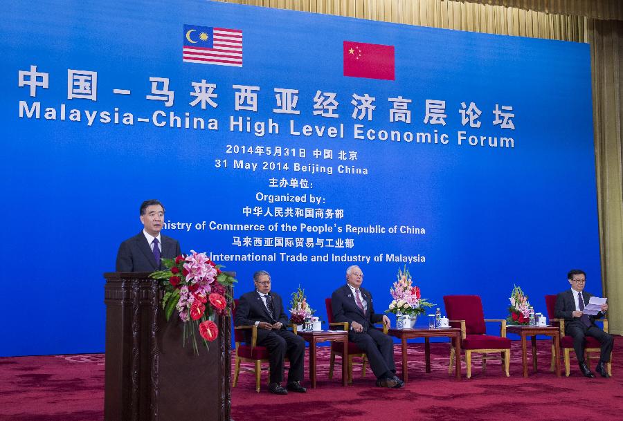 | Chinese Vice Premier Wang Yang (1st L) speaks at the Malaysia-China High Level Economic Forum in Beijing, capital of China, May 31, 2014. Malaysian Prime Minister Najib Razak also attended the forum on Saturday. (Xinhua/Wang Ye) |