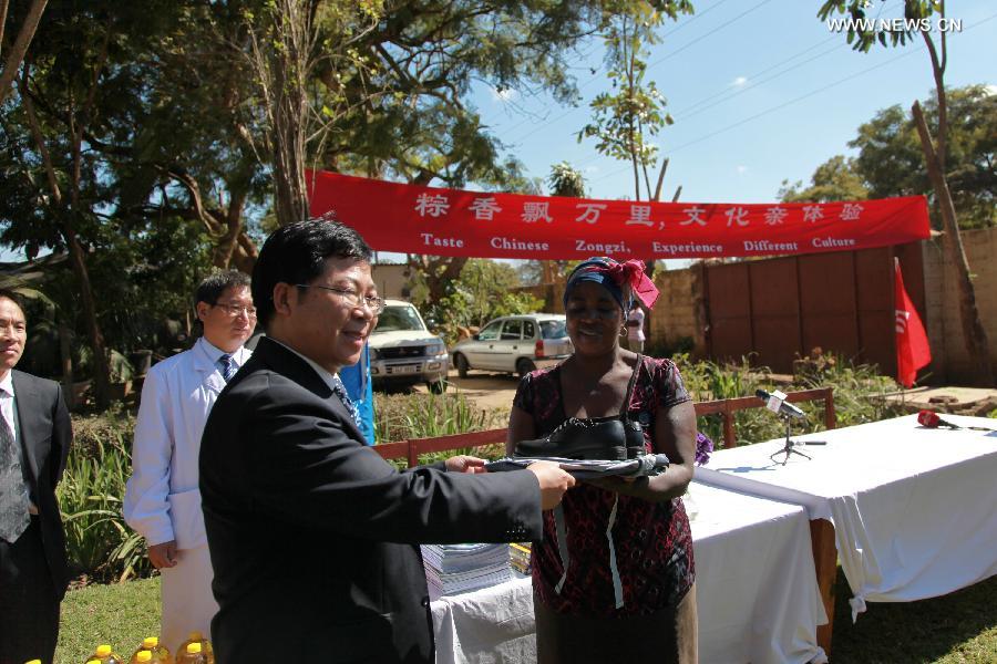 | Peng Zhaohui (1st front), deputy manager of Sino-hydro Zambia hands over donated goods to Kabwata Orphanage in Lusaka, capital of Zambia, May 31, 2014. Three Chinese organizations -- Sino-Hydro Zambia Limited, Confucius Institute and Chinese medical team -- donated goods to the orphanage, which has about 50 children from 11 months to 18 years old. (Xinhua/Peng Lijun) |