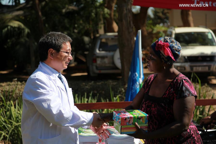 Chinese medical team representative (L) hands over donated goods to Kabwata Orphanage in Lusaka, capital of Zambia, May 31, 2014. Three Chinese organizations -- Sino-Hydro Zambia Limited, Confucius Institute and Chinese medical team -- donated goods to the orphanage, which has about 50 children from 11 months to 18 years old. (Xinhua/Peng Lijun)