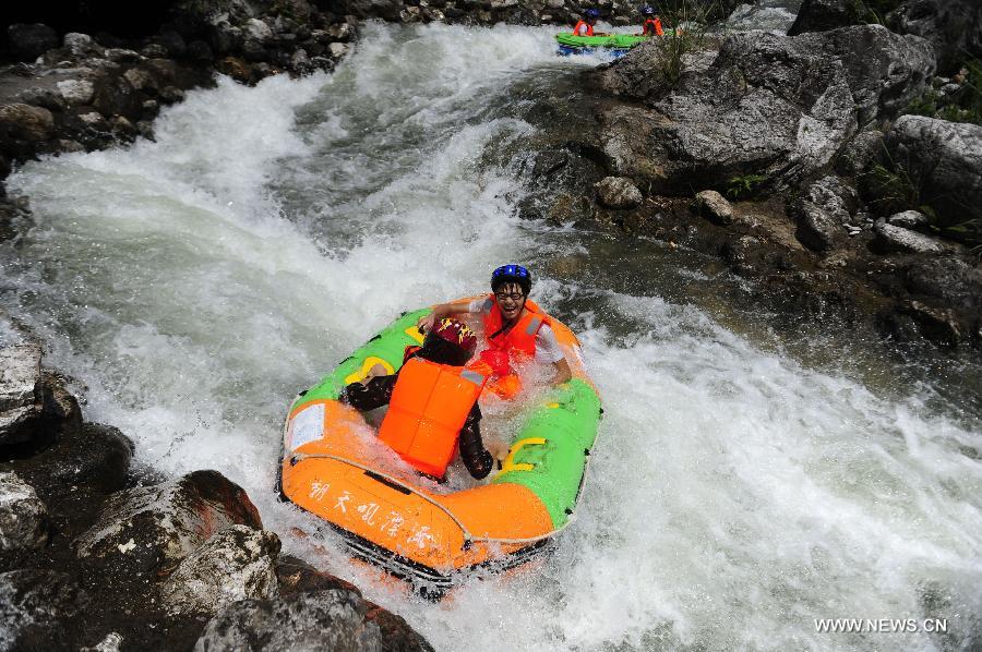 Tourists drift by rafts at the Chaotianhou scenery spot in Xingshan County, central China's Hubei Province, June 1, 2014, the second day of the Dragon Boat Festival holiday. By drifting down the stream, tourists could enjoy the beautiful landscape in the scenery spot. (Xinhua/Du Huaju)