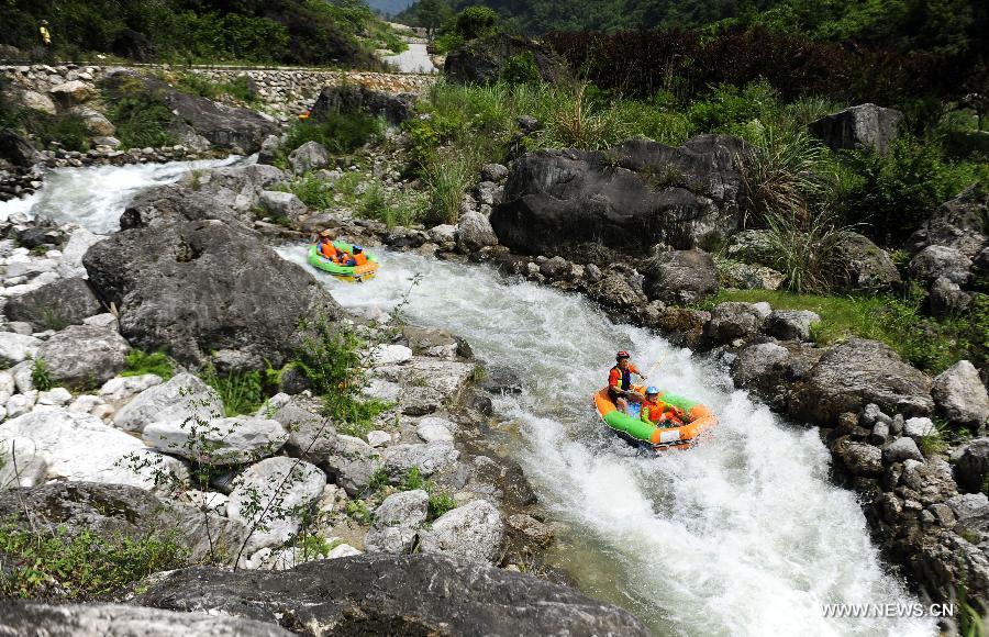 Tourists drift by rafts at the Chaotianhou scenery spot in Xingshan County, central China's Hubei Province, June 1, 2014, the second day of the Dragon Boat Festival holiday. By drifting down the stream, tourists could enjoy the beautiful landscape in the scenery spot. (Xinhua/Du Huaju)