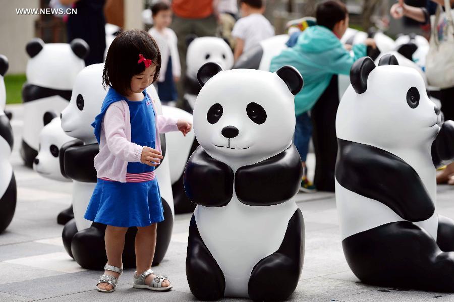 A child watches a lovely "panda" during the "1St panda" exhibition at Kerry Center Square in Shanghai, east China, June 2, 2014. A total of 100 pandas made of leftover moso bamboos were displayed during the exhibition. (Xinhua/Lai Xinlin)