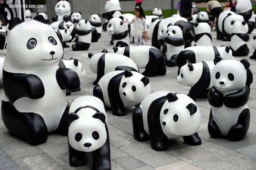 Lovely "pandas" are seen during "1St panda" exhibition at Kerry Center Square in Shanghai, east China, June 2, 2014. A total of 100 pandas made of leftover moso bamboos were displayed during the exhibition. (Xinhua/Lai Xinlin)