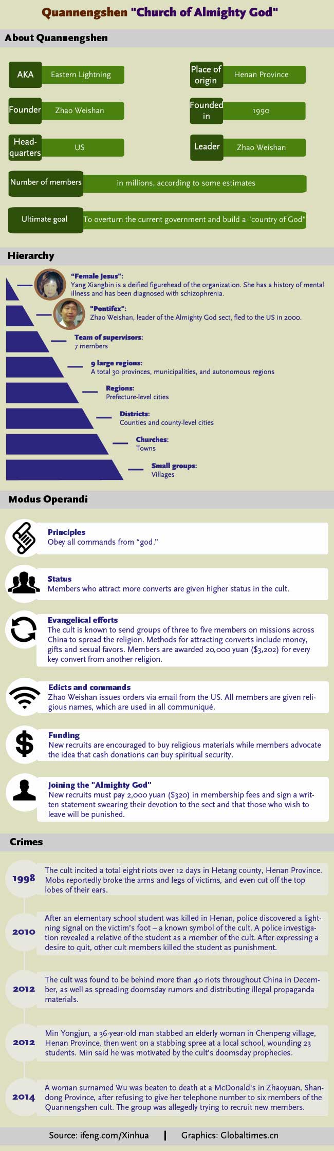 JINAN --Six suspects detained for intentional homicide in East China's Shandong province are members of a heretic sect, local police announced on Saturday.