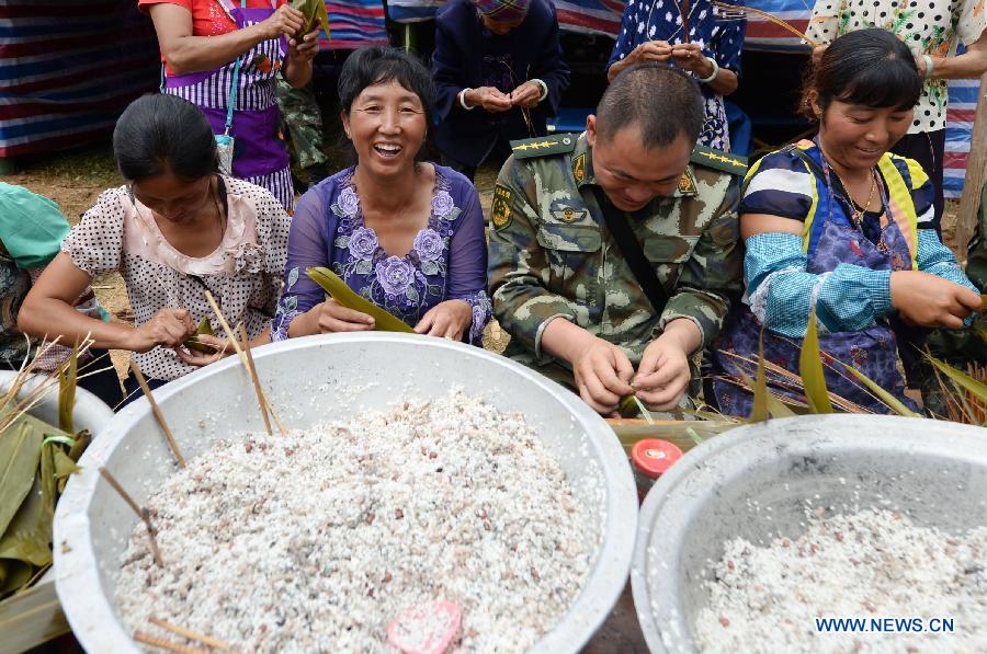 An armed police officer makes Zongzi, a glutinous rice dumpling, along with earthquake-afflicted residents to celebrate the Dragon Boat Festival at a makeshift settlement in Hanxinlang Village under Kachang Town of Yingjiang County, Dehong Dai and Jingpo Autonomous Prefecture, southwest China's Yunnan Province, June 2, 2014. Yingjiang County was hit by a 6.1-magnitude earthquake on May 30 and a 5.6-magnitude one on May 24. The Dragon Boat Festival, also known as Duanwu, is celebrated annually on the fifth day of the fifth month of the Chinese lunar calendar, which falls on June 2 this year. (Xinhua/Hu Chao)