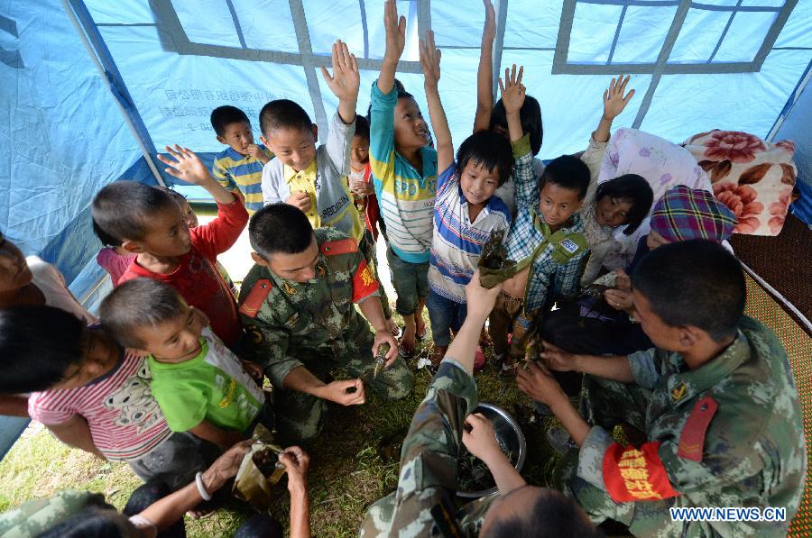 Armed police officers distrbute Zongzi, a glutinous rice dumpling, to kids as they celebrate the Dragon Boat Festival at a makeshift settlement in the earthquake-afflicted Hanxinlang Village under Kachang Town of Yingjiang County, Dehong Dai and Jingpo Autonomous Prefecture, southwest China's Yunnan Province, June 2, 2014. Yingjiang County was hit by a 6.1-magnitude earthquake on May 30 and a 5.6-magnitude one on May 24. The Dragon Boat Festival, also known as Duanwu, is celebrated annually on the fifth day of the fifth month of the Chinese lunar calendar, which falls on June 2 this year. (Xinhua/Hu Chao)