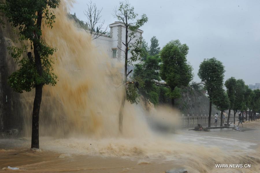 Photo taken on June 3, 2014 shows the flood water cascading in Pingba County of Anshun city, southwest China's Guizhou province. Heavy rain has battered most areas of Guizhou since Monday. (Xinhua/Ou Dongqu)