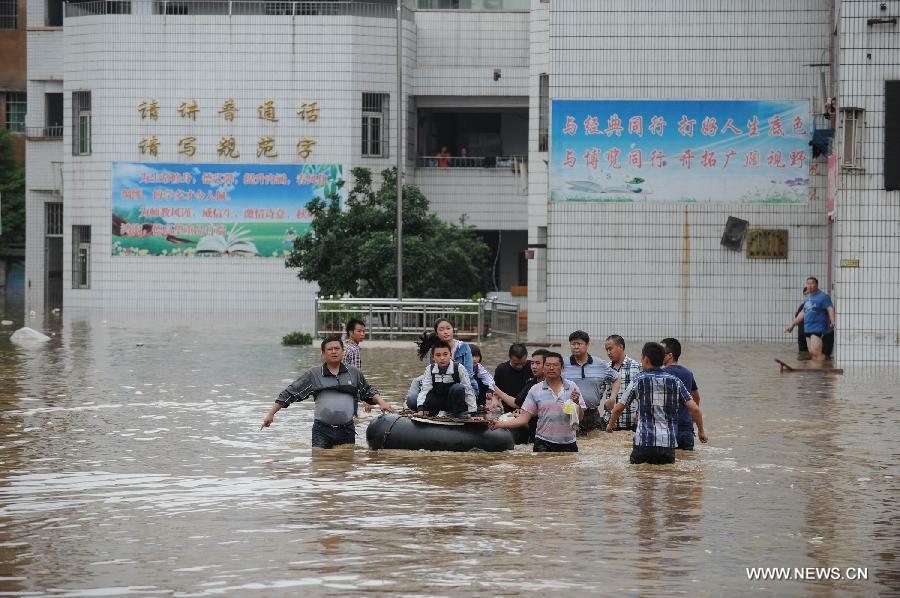 Rescuers transfer children trapped in a flooded elementary school in Pingba County of Anshun city, southwest China's Guizhou province, June 3, 2014. Heavy rain has battered most areas of Guizhou since Monday. (Xinhua/Ou Dongqu)