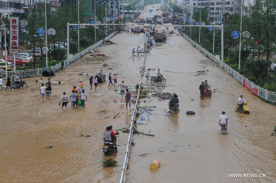 People are seen on a waterlogged road in Pingba County of Anshun city, southwest China's Guizhou province, June 3, 2014. Heavy rain has battered most areas of Guizhou since Monday. (Xinhua/Ou Dongqu)