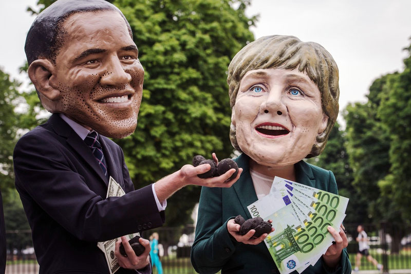 Oxfam demonstrators wearing masks of the G7 leaders demonstrate for an energy secure world near the EU Council in Brussels, Tuesday June 3, 2014. (Source: huanqiu.com)