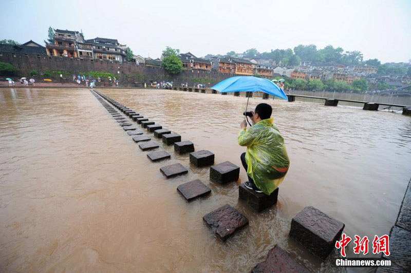 A scenic spot nearly submerged by river water in the Fenghuang Ancient Town, a famous tourist site in central China's Hunan province, attracts many visitors and photographers to the area on June 2, 2014. Recently, continuous rain has created a surge in river-water levels. [Photo: Chinanews.cn/Yang Huafeng]