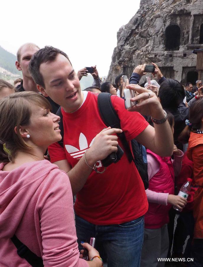 Two foreign tourists visit the Longmen Grottoes in Luoyang, central China's Henan Province, April 19, 2014. Luoyang, one of the cradles of Chinese civilization and one of the "Four Great Ancient Capitals of China", tries to integrate its tourism spots, an effort to build a "Chinese Culture City."(Xinhua/Wang Song)