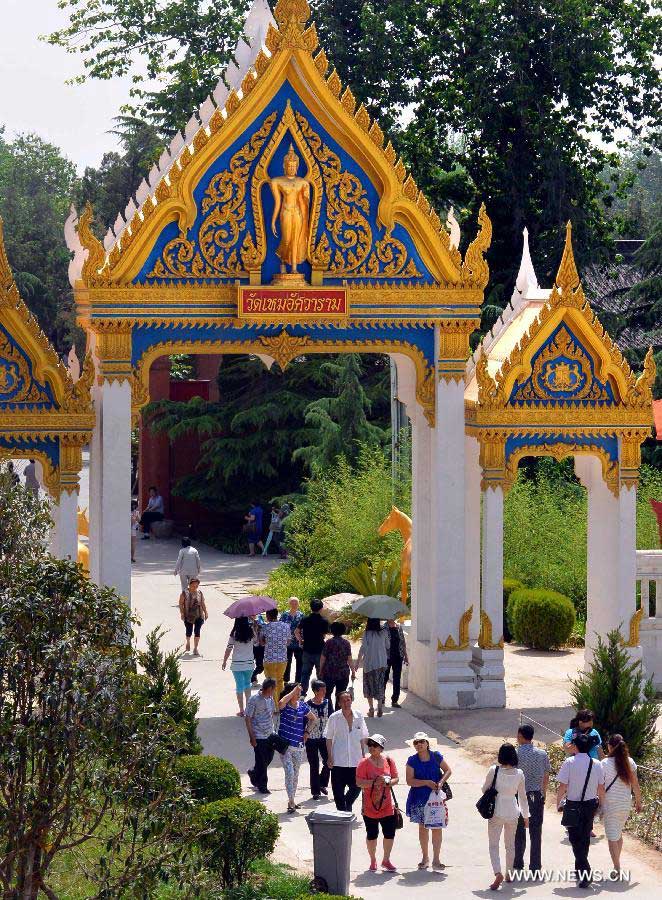 Tourists visit the Thai-style Buddhist Temple at White Horse Temple in Luoyang, central China's Henan Province, May 29, 2014. Luoyang, one of the cradles of Chinese civilization and one of the "Four Great Ancient Capitals of China", tries to integrate its tourism spots, an effort to build a "Chinese Culture City."(Xinhua/Wang Song)