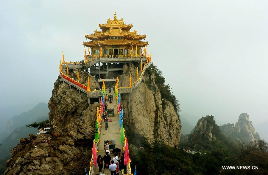 Tourists visit the Jade Emperor Summit of Laojun Mountain in Luoyang, central China's Henan Province, Sept. 21, 2013. Luoyang, one of the cradles of Chinese civilization and one of the "Four Great Ancient Capitals of China", tries to integrate its tourism spots, an effort to build a "Chinese Culture City."(Xinhua/Wang Song)