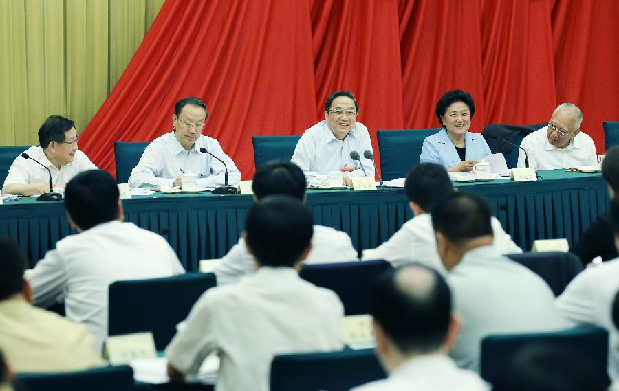 | Yu Zhengsheng (C, back), a member of the Standing Committee of the Political Bureau of the Communist Party of China (CPC) Central Committee and chairman of the National Committee of the Chinese People's Political Consultative Conference (CPPCC), attends a meeting held by the CPPCC National Committee on deploying a modern vocational education program in Beijing, capital of China, June 3, 2014. (Xinhua/Yao Dawei) |