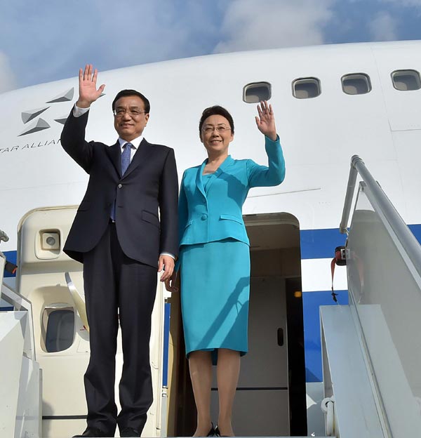 Li Keqiang and Cheng Hong arrive in Angola's capital Luanda on May 8. (Photo/ Xinhua)