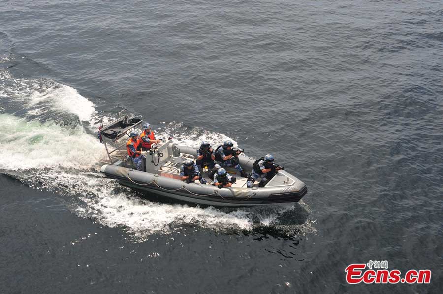The 16th Chinese Navy escort fleet and Cameroon navy conduct anti-piracy exercises at Gulf of Guinea on June 2, 2014 (local time). The exercises, first of its kind between the two countries, aim to improve capabilities of maintaining maritime security and combating maritime threats. (Photo/China News Service)