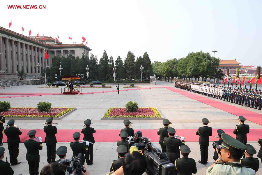 Chinese Premier Li Keqiang holds a welcoming ceremony for Kuwaiti Prime Minister Sheikh Jaber Al-Mubarak Al-Hamad Al-Sabah before their talks in Beijing, capital of China, June 3, 2014. (Xinhua/Liu Weibing)