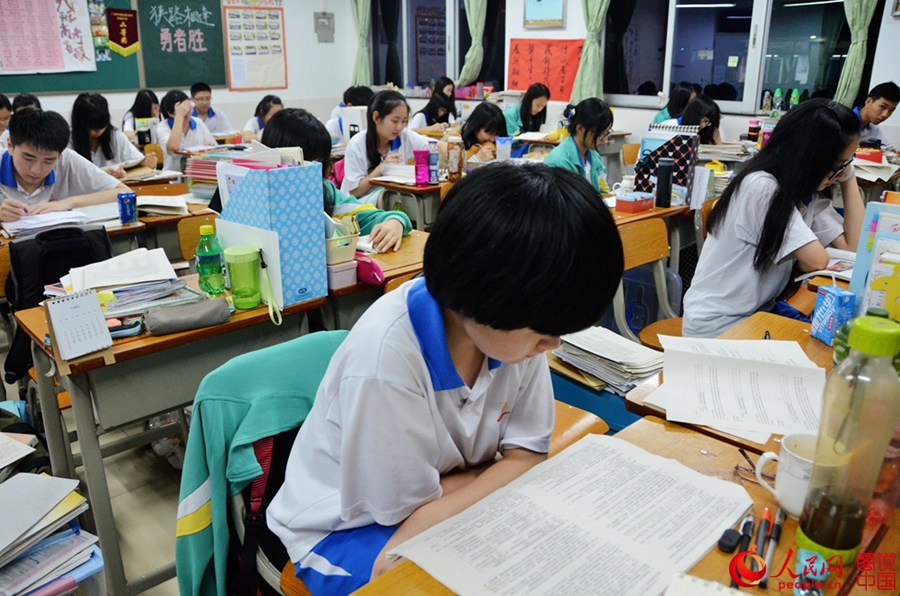 There are signs and slogans stuck on the walls of the classrooms and the hall. Reading materials are piled up beside the desks. Some students are busy with reviewing; some are dealing with unsolved problems and some are consulting with their teachers. They try to adjust themselves to the best status to face the crucial moment in their life.