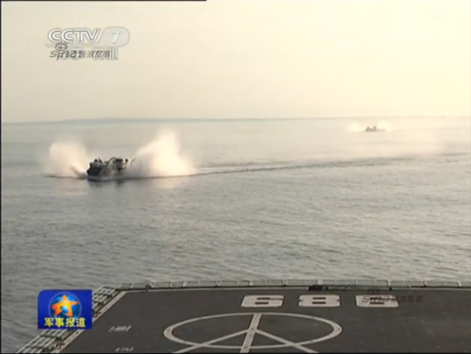 Two air cushion ships from the amphibian landing craft Changbaishan participate in the actual-combat training.