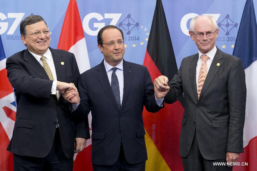 President of the European Commission Jose Manuel Barroso (L) and European Council President Herman Van Rompuy (R) welcome French President Francois Hollande (C) during the G7 summit in Brussels, Belgium, June 4, 2014. (Xinhua/The Council of the European Union)
