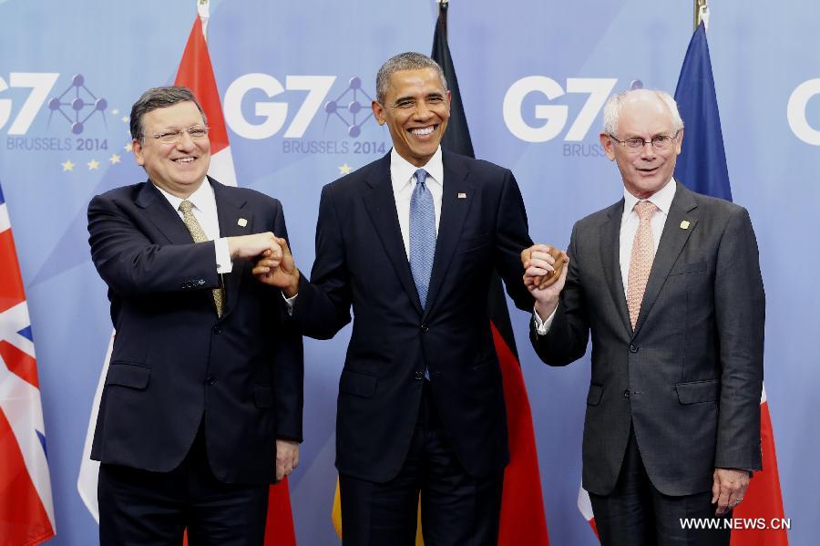 President of the European Commission Jose Manuel Barroso (L) and European Council President Herman Van Rompuy (R) welcome U.S. President Barack Obama (C) during the G7 summit in Brussels, Belgium, June 4, 2014. (Xinhua/The Council of the European Union)