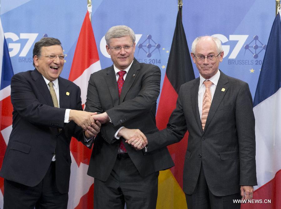 President of the European Commission Jose Manuel Barroso (L) and European Council President Herman Van Rompuy (R) welcome Canadian Prime Minister Stephen Harper (C) during the G7 summit in Brussels, Belgium, June 4, 2014. (Xinhua/The Council of the European Union)