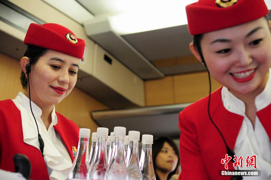 Train conductors of Uyghur descent give bottles of water during a trial run of a high-speed train linking the northwest Chinese provincial capital cities of Lanzhou, in Gansu province, and Urumqi, in the Xinjiang Uyghur Autonomous Region, on Jun 3, 2014. The 1,776km-long railway is expected to begin operations at the end of the year. This will also be the first high-speed railway in Xinjiang. [Photo: Chinanews.com]