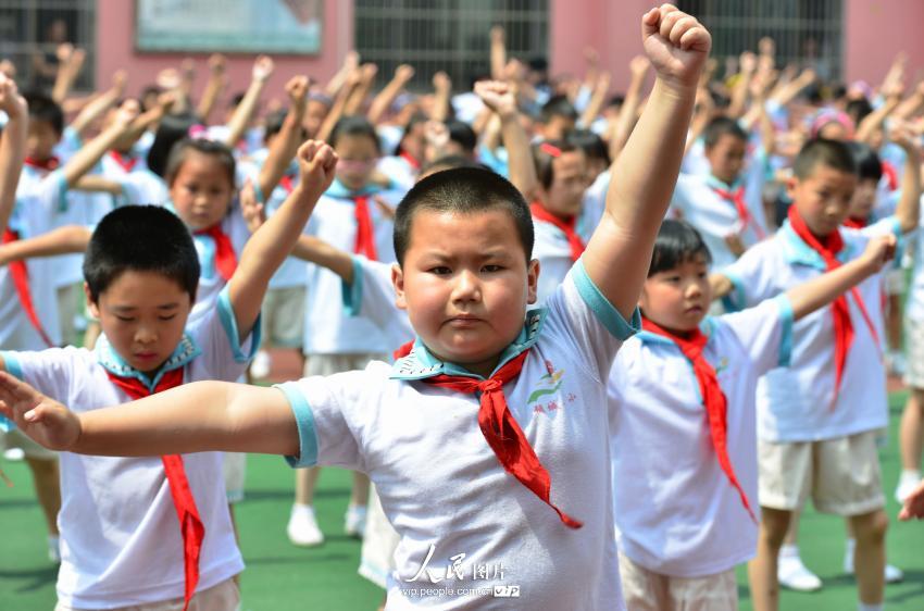 After over a month's practice, more than 1,100 students and teachers do the martial arts exercise "Rising Sun" for the first time in Choucheng Third Primary School in Yiwu, east China's Zhejiang Province, June 4, 2014. Every gesture and motion was well performed by the students. Since June 4, this martial arts exercise would be the class-break exercise of the school. According to Gong Jinta, the martial arts coach, the exercise is a combination of long boxing, Southern style boxing and other martial arts styles and it is popular among students due to its traditional features. (vip.people.com.cn/Lv Bin)