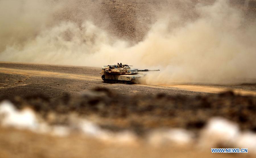 A tank is seen during the "Eager Lion" military drill at the Gulf of Aqaba, some 330 kilometers south of Amman, Jordan, June 5, 2014. The Jordan-hosted "Eager Lion" international military drill with the participation of 22 countries seeks to strengthen the skills of the Jordanian army and enhance cooperation, the army said.(Xinhua/Mohammad Abu Ghosh)