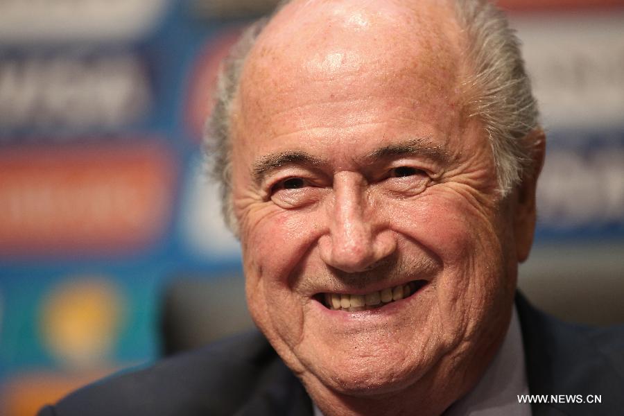 FIFA's president Joseph Blatter smiles during a press conference following a meeting of the FIFA Organising Committee for the World Cup 2014 in Sao Paulo, Brazil, on June 5, 2014. Sao Paulo will host the opening match of the World Cup on June 12. (Xinhua/Rahel Patrasso)