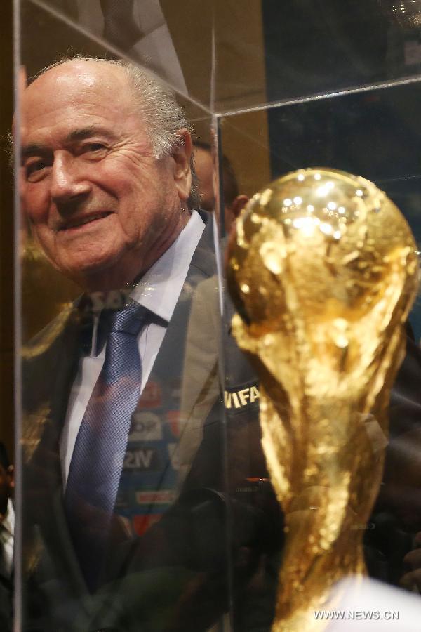 FIFA's president, Joseph Blatter poses next to the World Cup trophy after a press conference following a meeting of the FIFA Organising Committee for the World Cup 2014 in Sao Paulo, Brazil, on June 5, 2014. Sao Paulo will host the opening match of the World Cup on June 12. (Xinhua/Rahel Patrasso)